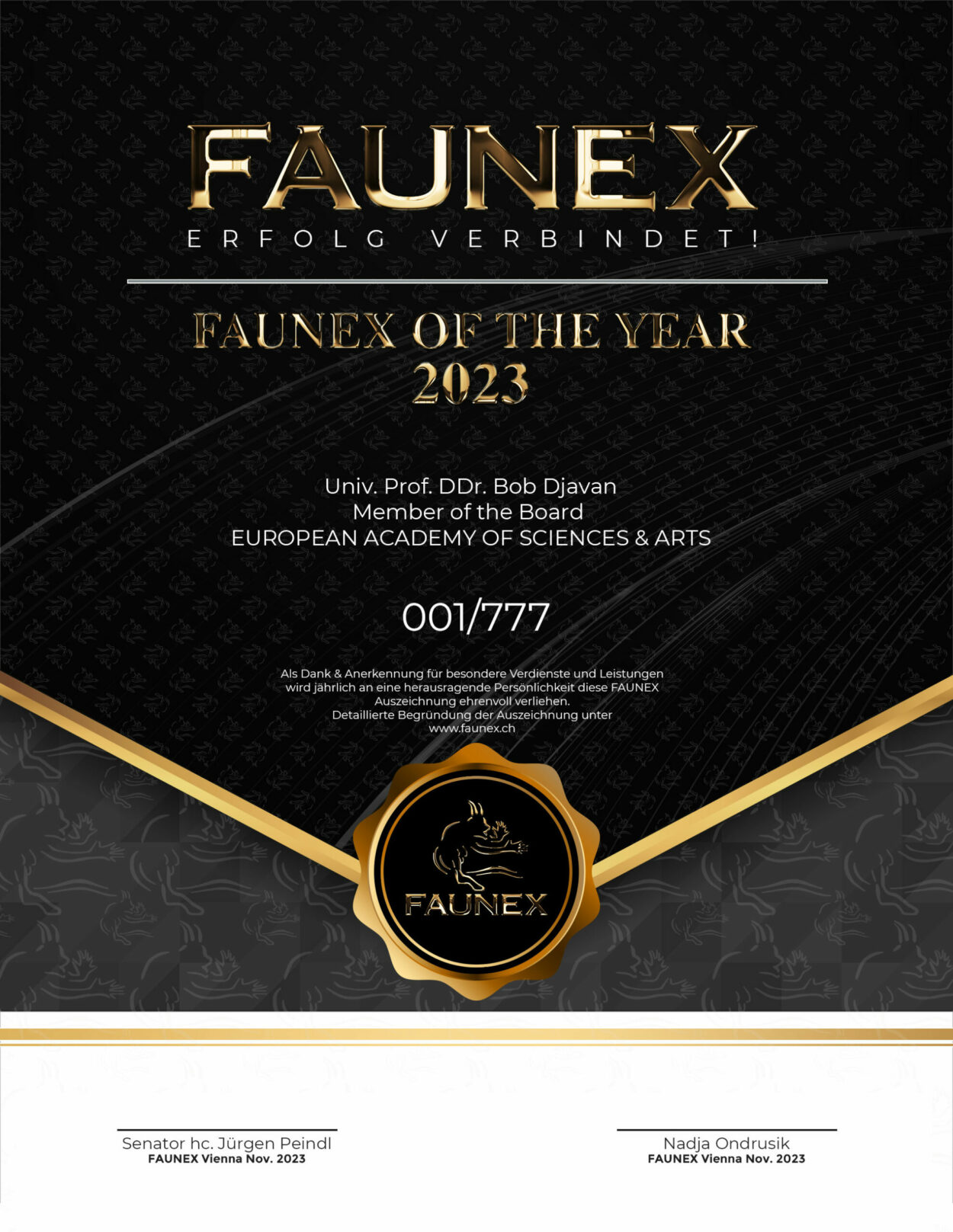 Einmal pro Jahr vergibt FAUNEX getreu der Markenphilosophie „Erfolg verbindet!“ diese ehrenvolle Auszeichnung an eine herausragende Persönlichkeit für deren Verdienste an/für der/die Gesellschaft.